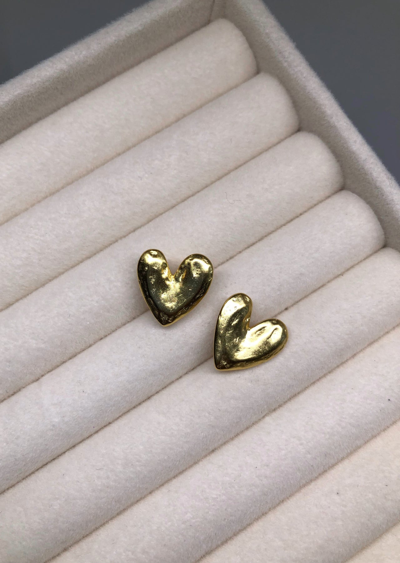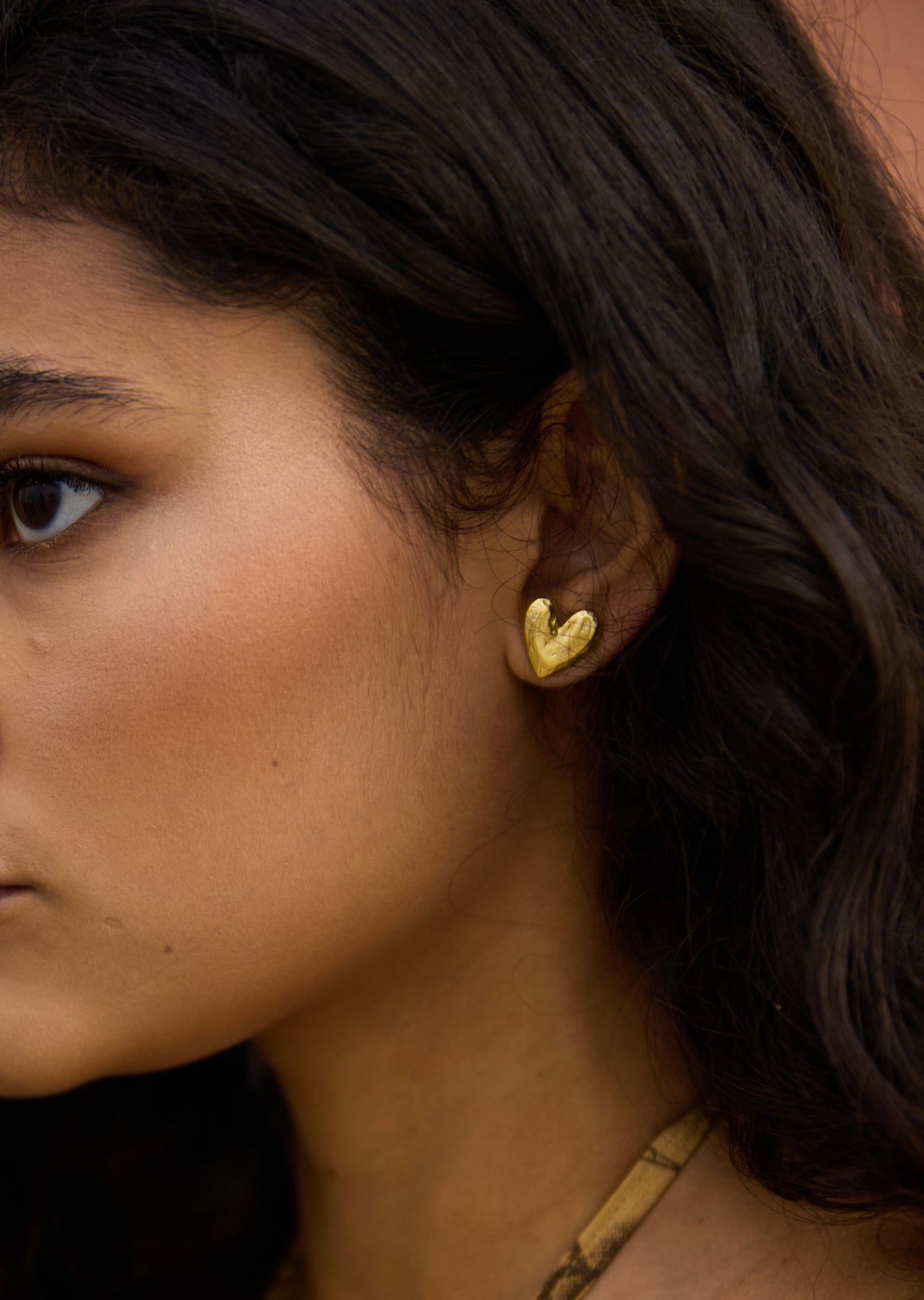 Arete en forma de corazón ideal como para acompañar un look súper casual como elegante, ya que el toque del dorado hace que resalte el look completo. Pieza de plata bañada en oro.