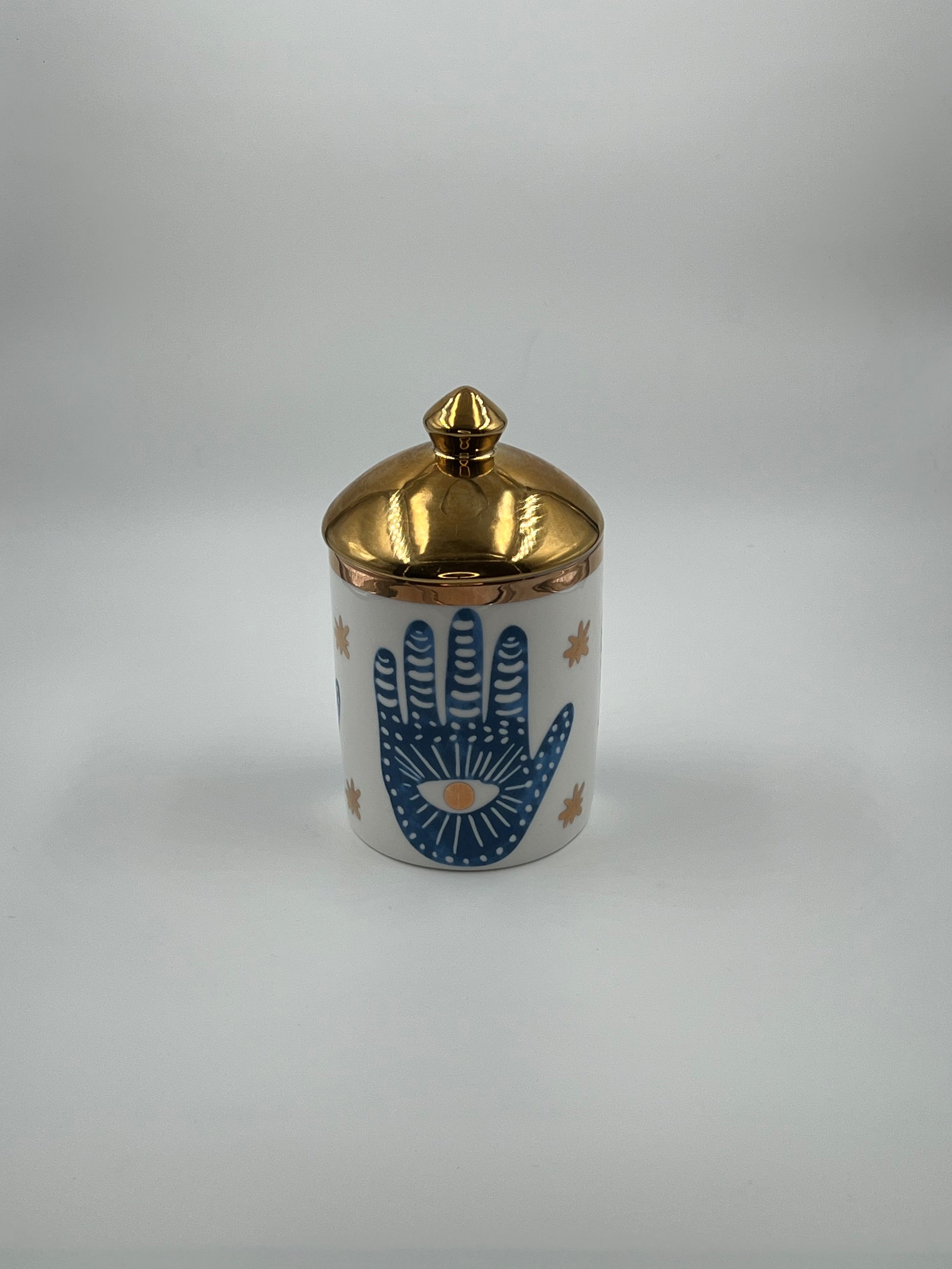 Azucarero con mano turca decorativa, tapa metálica dorada, diseño simbólico y funcional refinado.