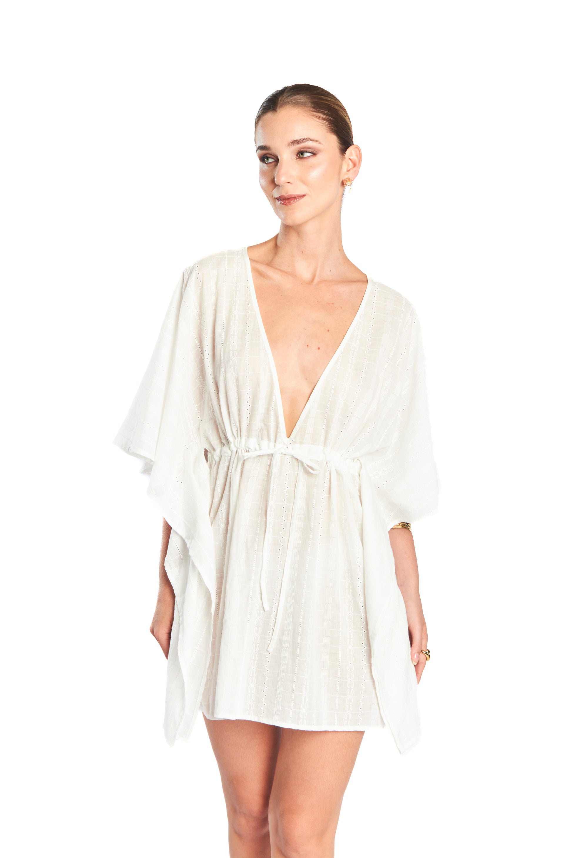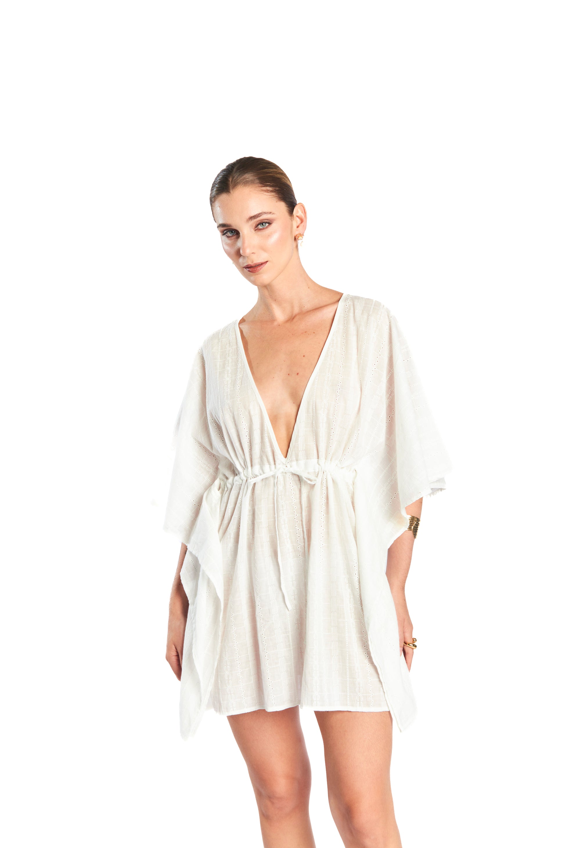 Salida de playa corta con diseño fresco y juvenil. Su silueta suelta ofrece total libertad de movimiento, mientras que su confección en tejido suave la convierte en una opción ligera y chic para relajarte con estilo. Ideal para usar sobre el traje de baño o para un look veraniego desenfadado.