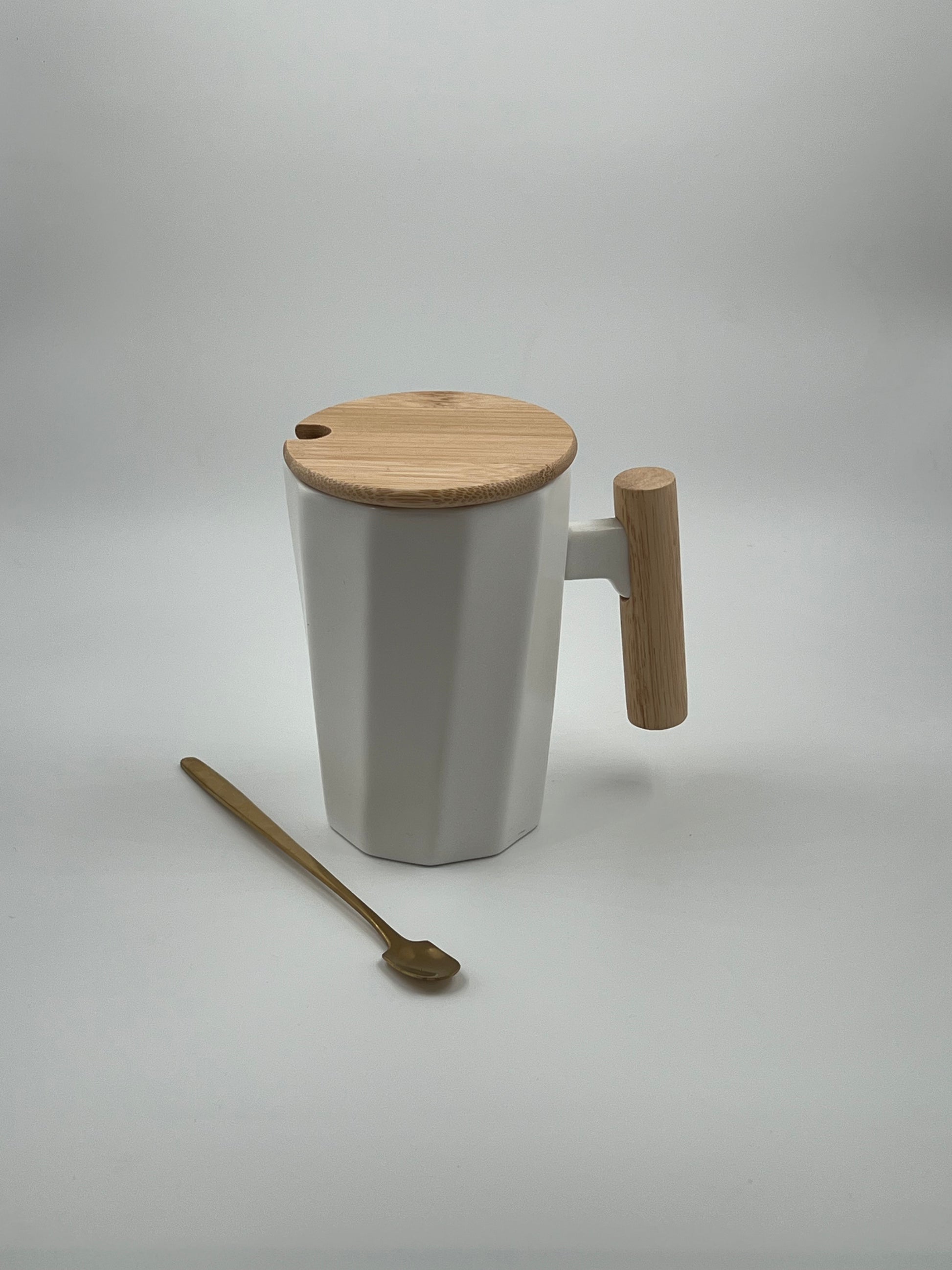 Taza con tapa, loza blanca, asa de madera, cuchara dorada, ideal para infusiones.