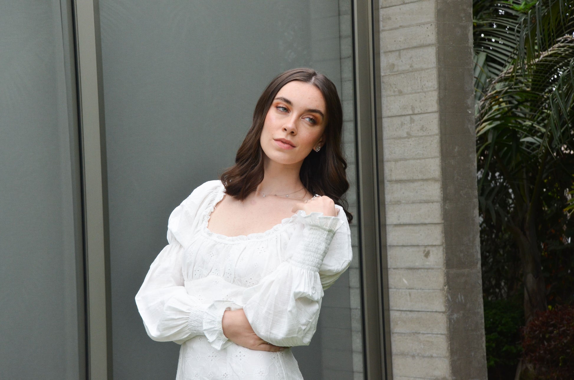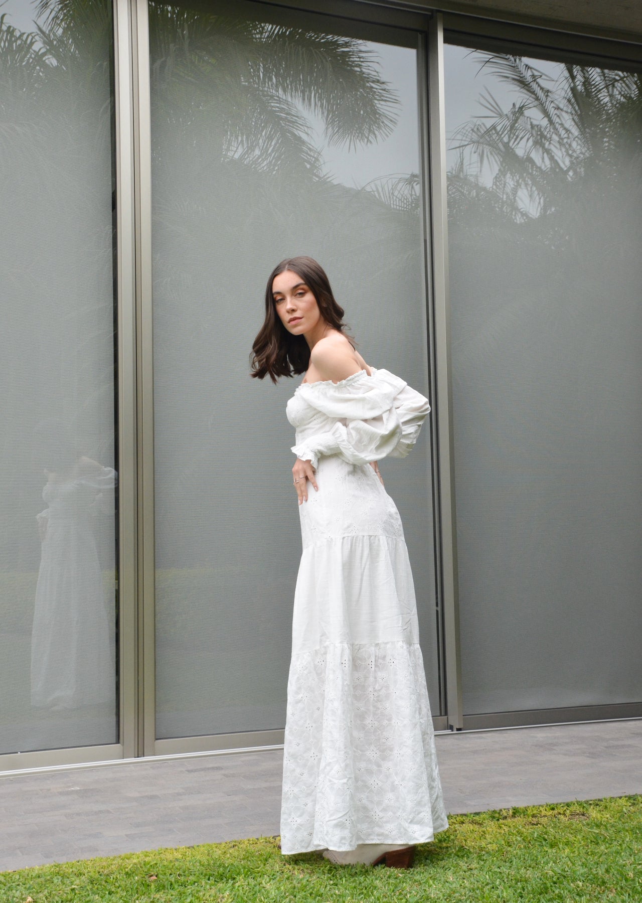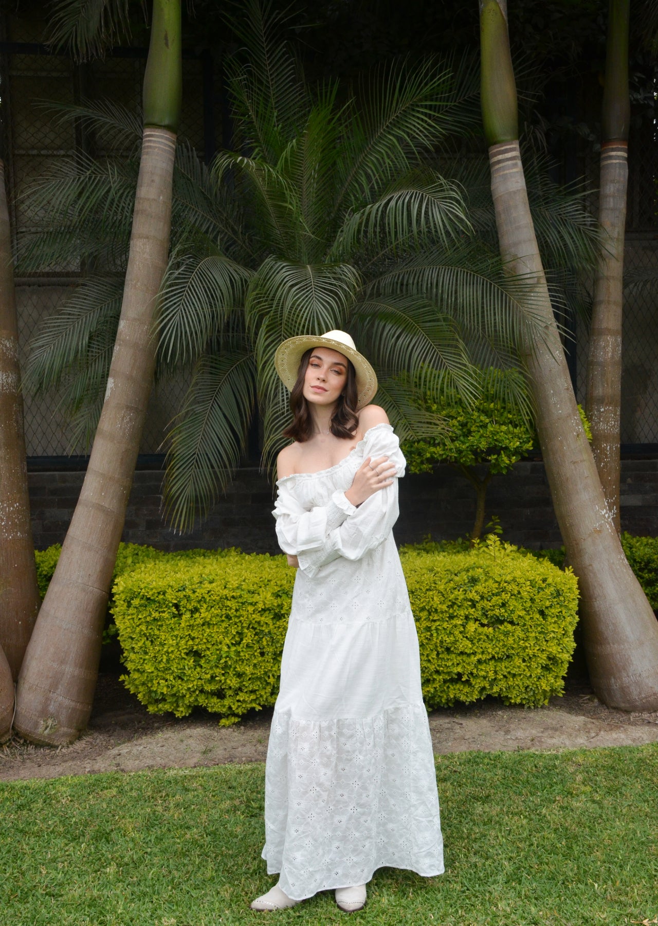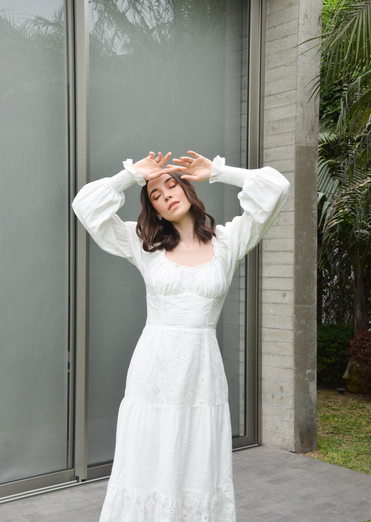 Vestido con mangas largas hecho de broderi y con detalles super lindos.